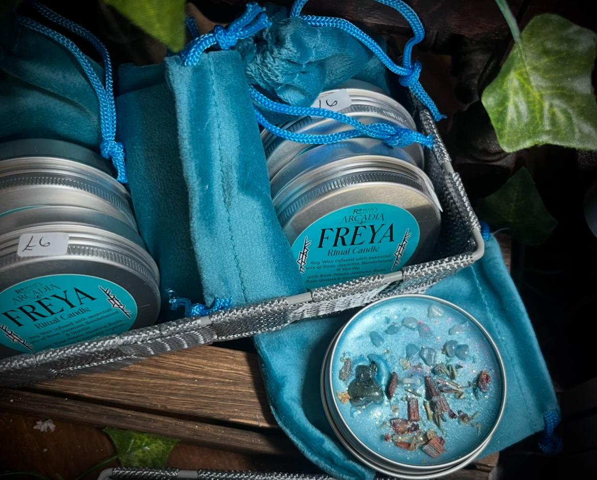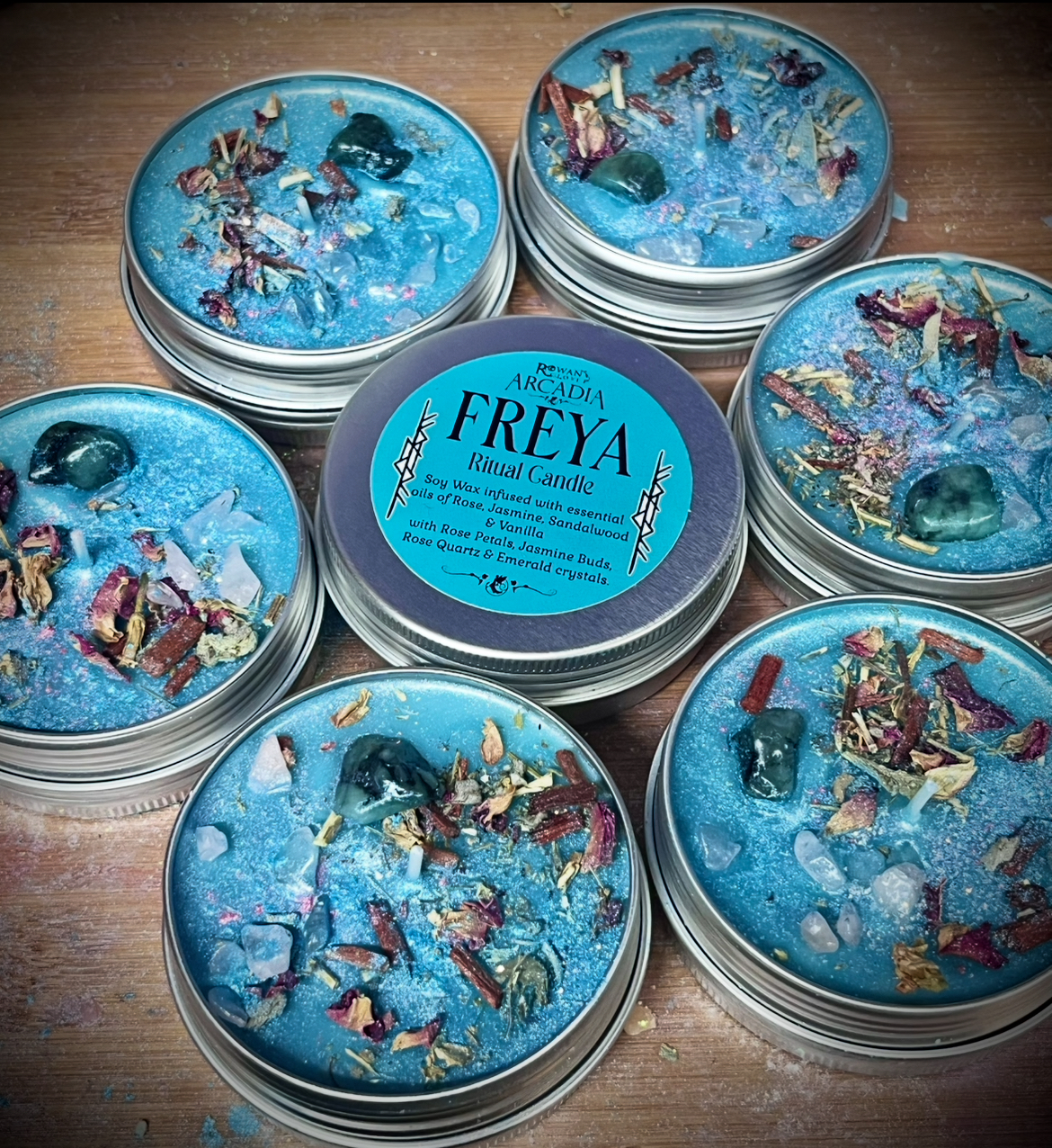 A 2oz candle in a reusable aluminium tin, infused with my Freya Perfume Oil, a uplifting, bold & vibrant blend of Rose, Sandalwood, Jasmine & Vanilla, topped with Jasmine & rose petals, rose quartz & emerald crystals & hand decorated with colours inspired by this beautiful Goddess 🩷✨💚🌸